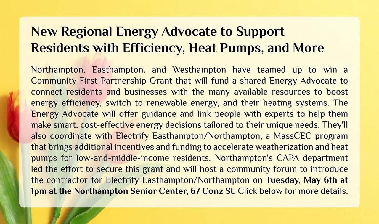 Smith Vocational and Agricultural High School 80 Locust St., Room Cafeteria and library, NorthamptonSunDay, September 21st, 2025, is a global day of action celebrating the unstoppable rise of clean energy. We’re celebrating and showcasing the ways Northampton and Easthampton and cities and towns and neighborhoods across the Connecticut River Valley are using solar and wind energy sources to power our lives without pollution. Come meet our city climate […]